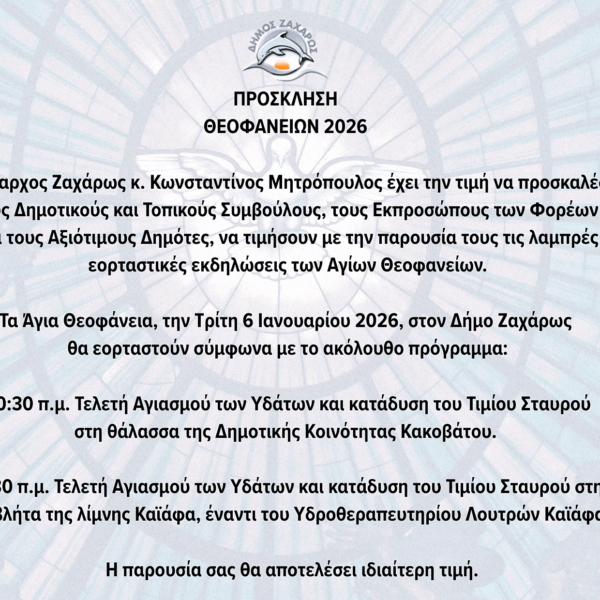 Πρόσκληση Εορτασμού Θεοφανείων 2026 – Δήμος Ζαχάρως