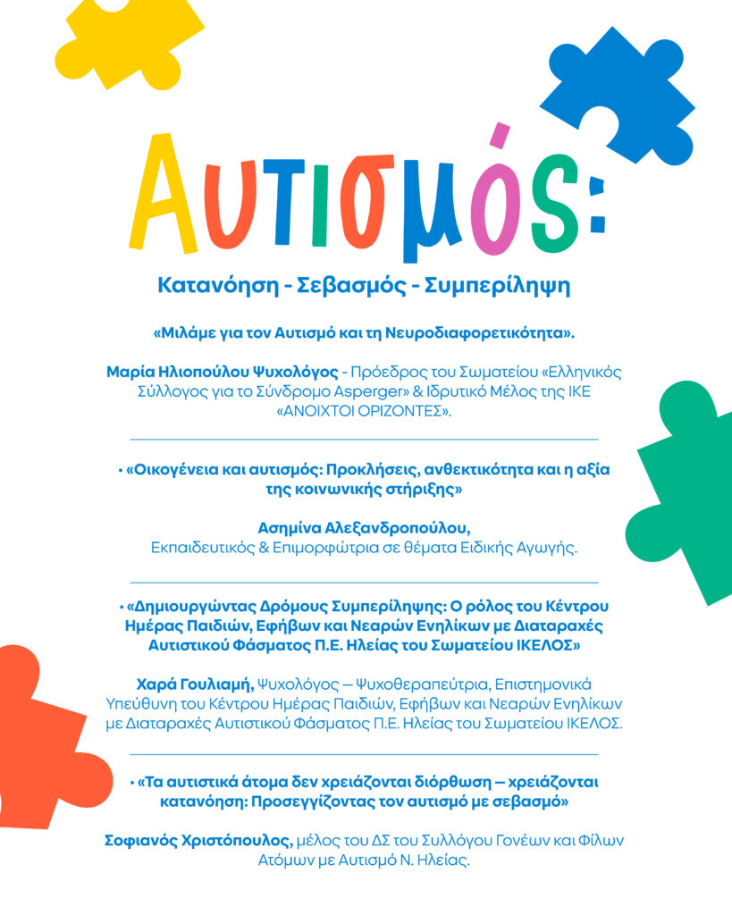 Ο Σοφιανός Χριστόπουλος, μέλος του Διοικητικού Συμβουλίου του Συλλόγου Γονέων και Φίλων Ατόμων με Αυτισμό Ν. Ηλείας, θα αναδείξει το θέμα «Τα αυτιστικά άτομα δεν χρειάζονται διόρθωση – χρειάζονται κατανόηση: Προσεγγίζοντας τον αυτισμό με σεβασμό».