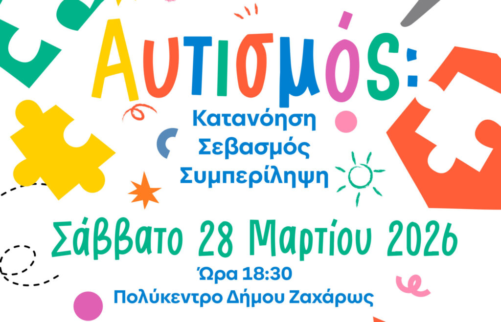Με αφορμή τη 2 Απριλίου, Παγκόσμια Ημέρα Αυτισμού, ο Δήμος Ζαχάρως διοργανώνει ενημερωτική ημερίδα το Σάββατο 28 Μαρτίου 2026, στις 18:30, στο Πολύκεντρο Δήμου Ζαχάρως, μέσω των κοινωνικών του δομών «Βοήθεια στο Σπίτι», «Κέντρο Κοινότητας», «ΚΗΦΗ» και «ΚΔΑΠ».
