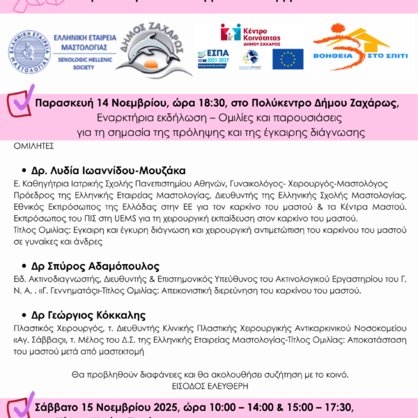 Ο Δήμος Ζαχάρως, σε συνεργασία με την Ελληνική Εταιρεία Μαστολογίας, σας προσκαλούν στο Διήμερο Forum Υγείας με θέμα: «Η ΥΓΕΙΑ ΤΟΥ ΜΑΣΤΟΥ, ΣΕ ΓΥΝΑΙΚΕΣ ΚΑΙ ΑΝΔΡΕΣ»
