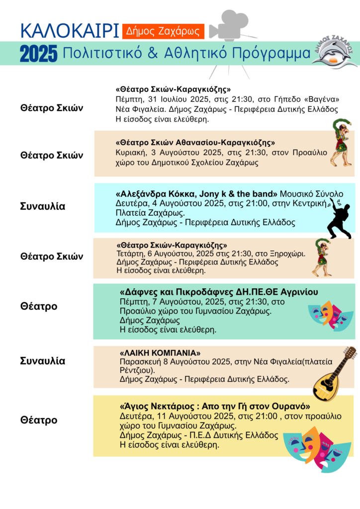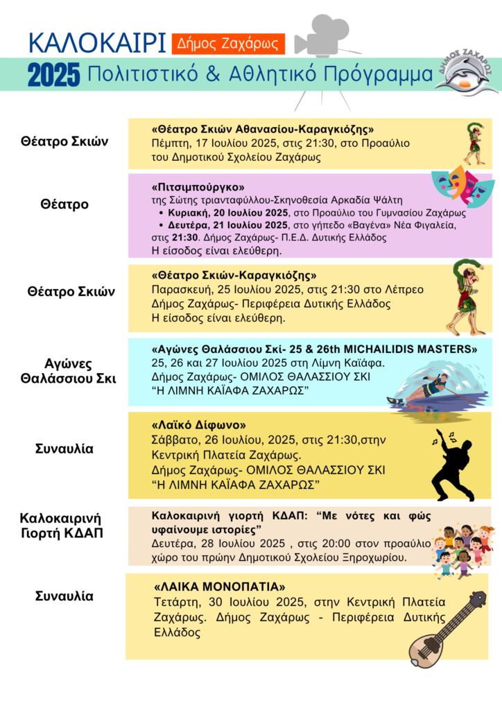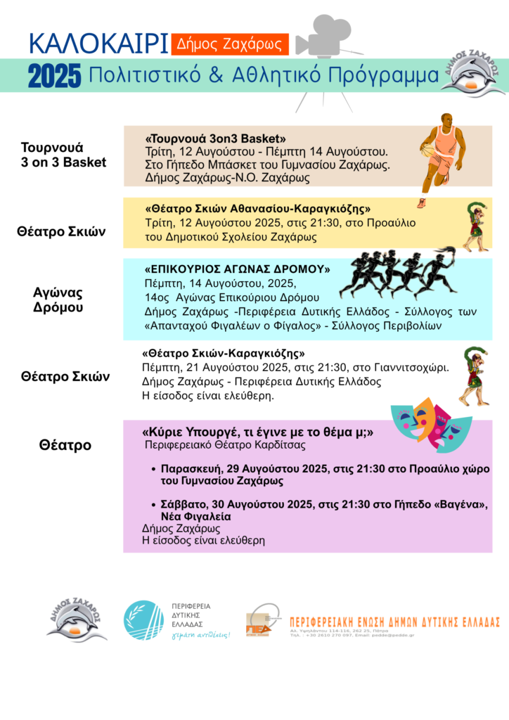 Το Πολιτιστικό & Αθλητικό Καλοκαίρι 2025 του Δήμου Ζαχάρως φέρνει ένα πλούσιο πρόγραμμα εκδηλώσεων για μικρούς και μεγάλους. Από θεατρικές παραστάσεις και συναυλίες μέχρι παιδικά θεάματα και αθλητικές συγκινήσεις, σας περιμένουν ξεχωριστές εμπειρίες που θα δώσουν μια μοναδική νότα στο καλοκαίρι μας, μέσα από διοργανώσεις του Δήμου και σημαντικές συνεργασίες.