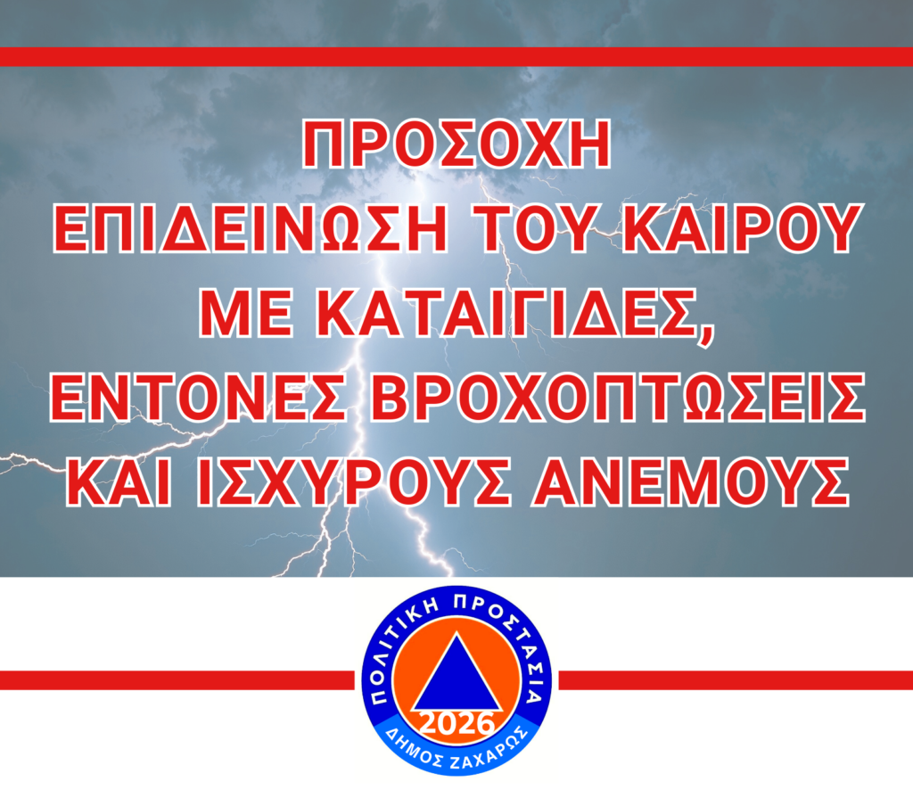 Ο Δήμος Ζαχάρως και η Πολιτική Προστασία βρίσκονται σε κατάσταση αυξημένης ετοιμότητας από σήμερα, Τετάρτη 11/02/2026, έως και την Παρασκευή 13/02/2026, προκειμένου να αντιμετωπιστούν άμεσα τυχόν προβλήματα.