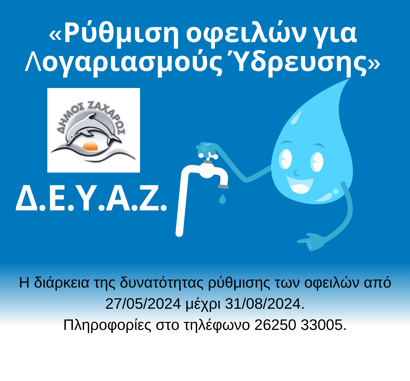 Με την υπ. αριθ. 63/2024 απόφαση της Δ.Ε.Υ.Α.Ζ. με θέμα «Ρύθμιση οφειλών από λογαριασμούς ύδρευσης» και ύστερα από την ενημέρωση και σύμφωνη γνώμη του Δημοτικού Συμβουλίου Ζαχάρως, αντιμετωπίζοντας με ιδιαίτερη ευαισθησία και κατανόηση τη δύσκολη οικονομική συγκυρία, την οποία διέρχονται όλα τα νοικοκυριά, η Δ.Ε.Υ.Α.Ζ. σας δίνει τη δυνατότητα ρύθμισης των ανεξόφλητων λογαριασμών σας με ευνοϊκούς όρους, με μικρή προκαταβολή και πολλές δόσεις.